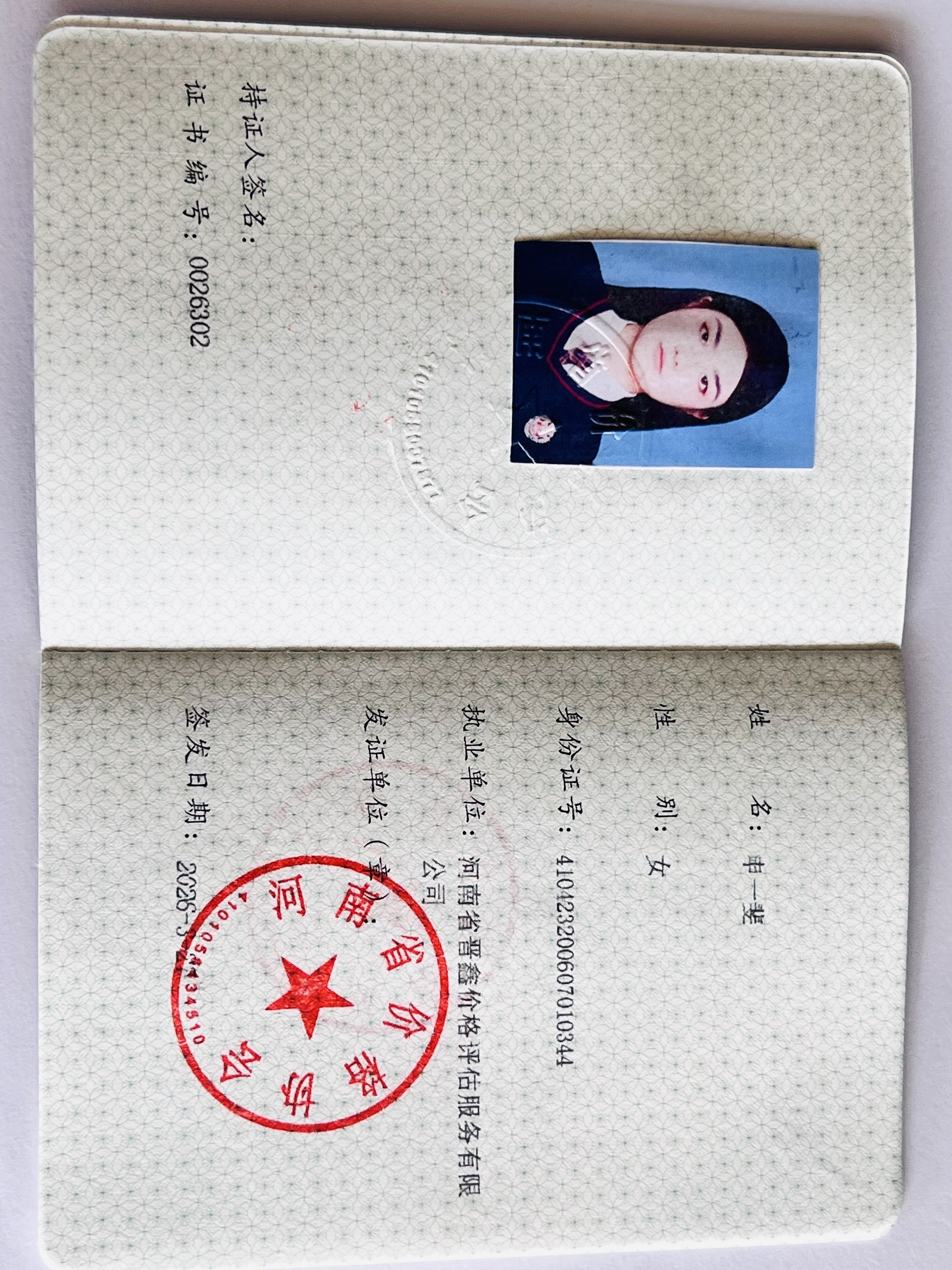 | 0026302 | 申一斐 | 综合类、涉诉讼类 | 河南省价格协会 | 2026-03-27 | 2029-03-26 | 查看证书 |