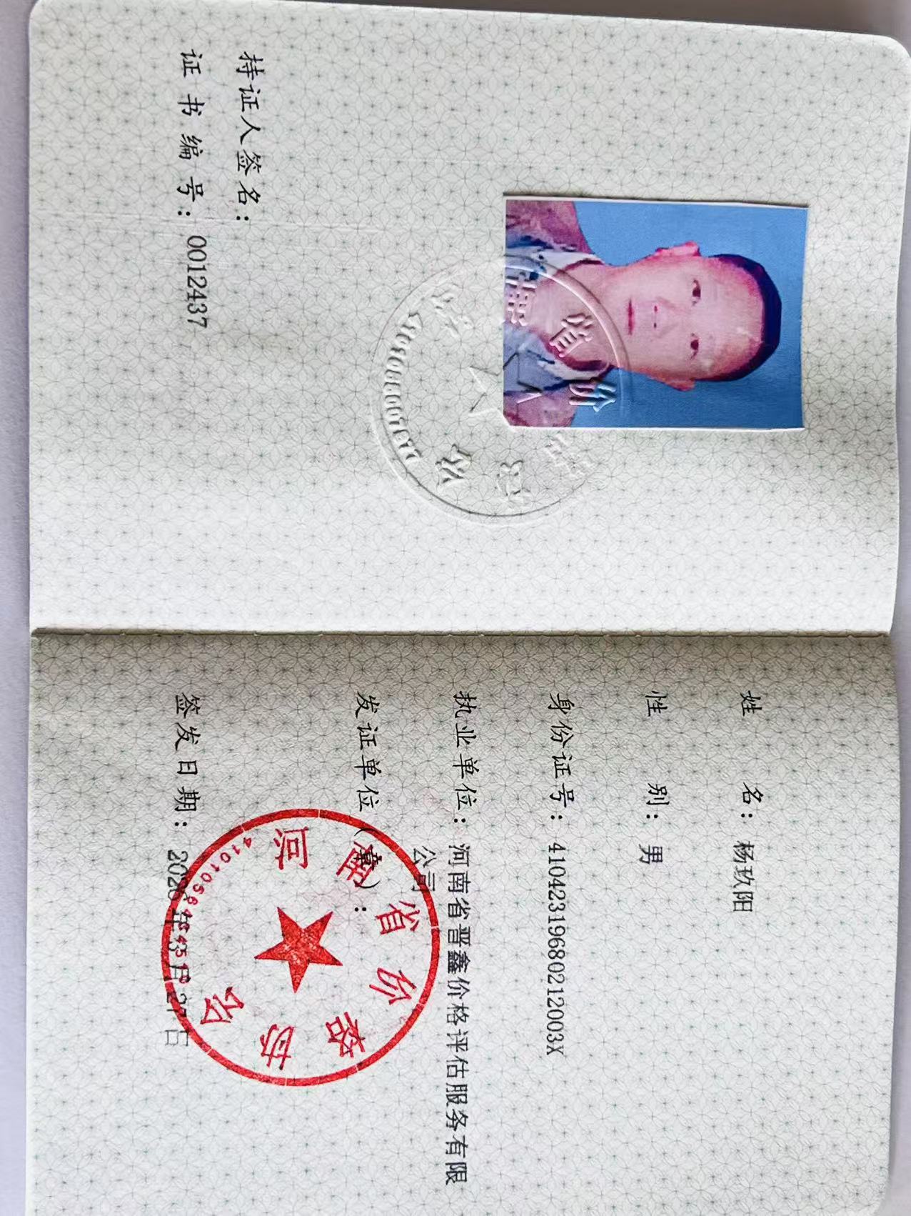 | 0012437 | 杨玖阳 | 综合类、涉诉讼类 | 河南省价格协会 | 2026-03-27 | 2029-03-26 | 查看证书 |