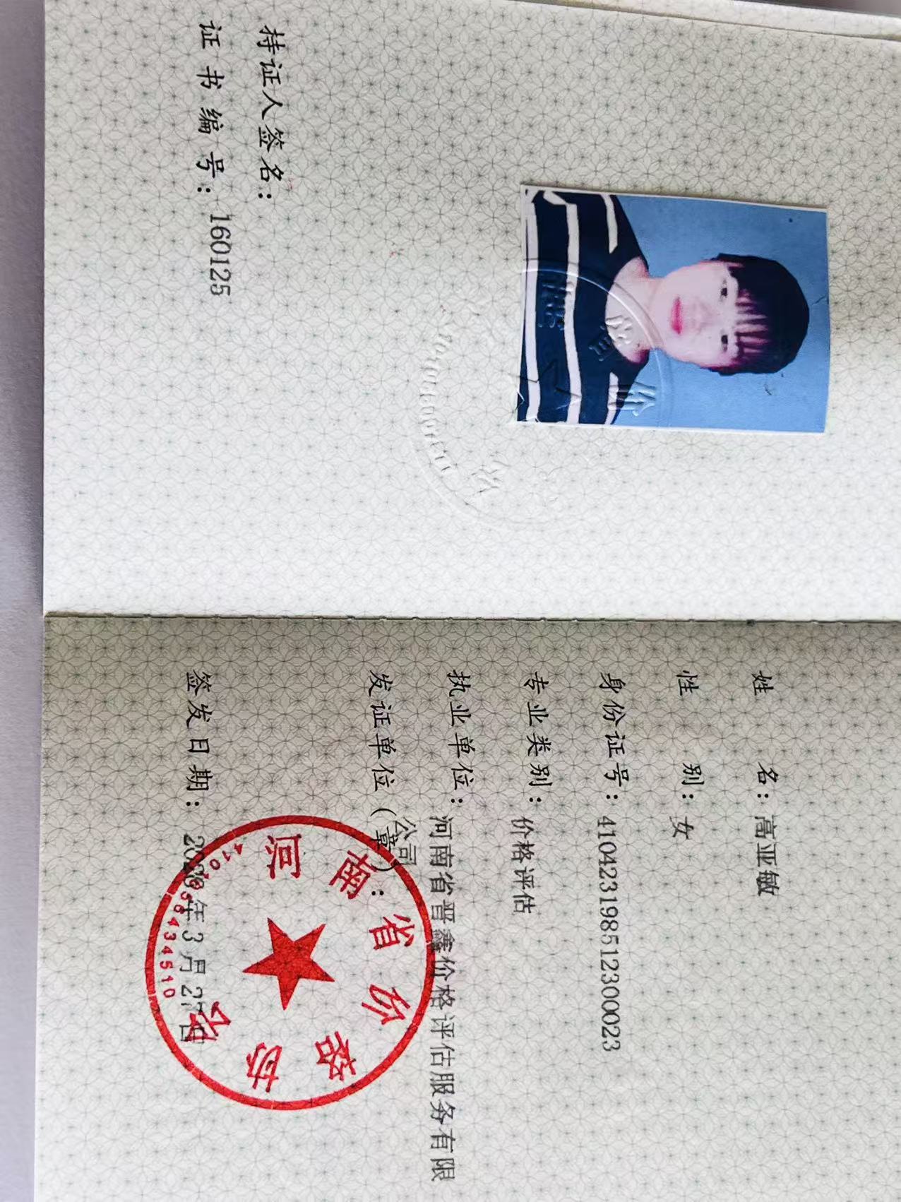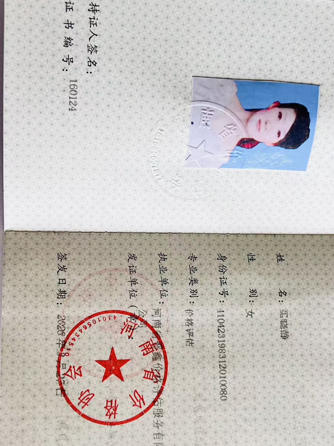 | 160125 | 高亚敏 | 综合类、涉诉讼类 | 河南省价格协会 | 2026-03-27 | 2029-03-26 | 查看证书 |