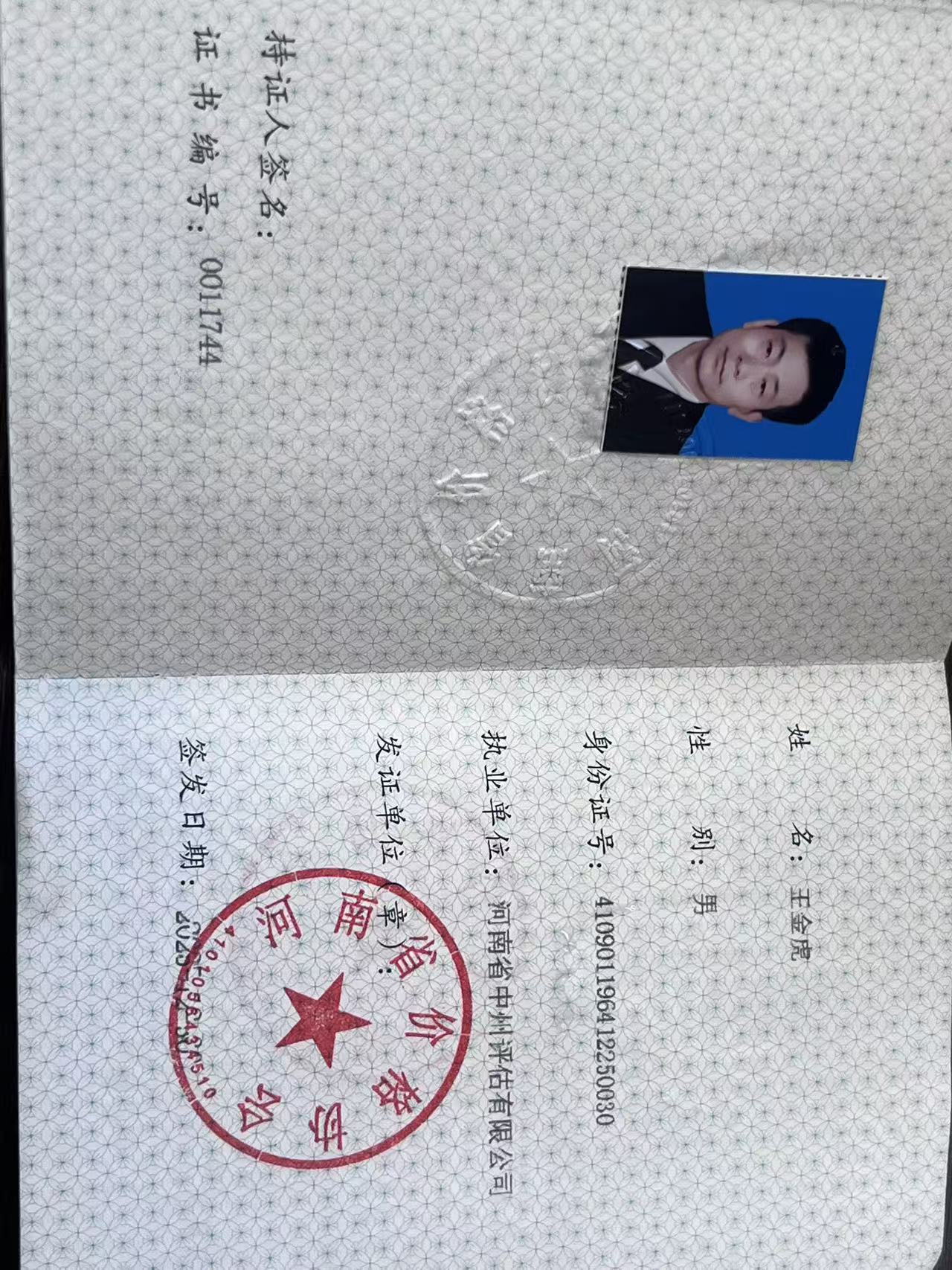 | 0011744 | 王金虎 | 综合类、涉诉讼类 | 河南省价格协会 | 2025-12-30 | 2028-12-29 | 查看证书 |